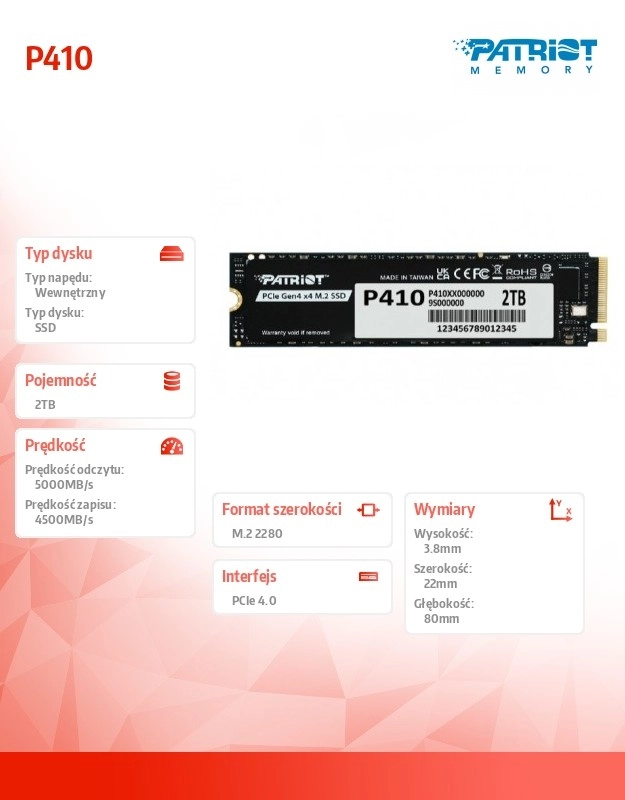 Gyorsítsa fel számítógépét a 2 TB kapacitású PATRIOT P410 SSD-vel. Akár 5000 MB/s olvasási és 4500 MB/s írási sebességet kínál, energiatakarékos működéssel a hosszabb akkumulátor-üzemidőért és kompakt M.2 2280 formátummal az egyszerű telepítéshez. A grafén hővezető rétegnek és a termikus védelemnek köszönhetően terhelés alatt is stabil teljesítményt nyújt – ideális játékosoknak, alkotóknak és profiknak.