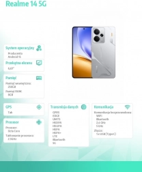 A stílusos Realme 14 5G Mecha Silver színben csúcsminőségű 6,67" AMOLED kijelzőt kínál 120 Hz frissítéssel és akár 2000 nit fényerővel, nagy teljesítményű Snapdragon 6 Gen 4 chippel, nagy kapacitású 6000 mAh akkumulátorral és kamerarendszerrel, melynek része a 50 MP-es fő kamera OIS-szel. Természetesen van 5G, Wi‑Fi 6, Bluetooth 5.2, Dual SIM és Android 15 Realme UI 6.0-val.