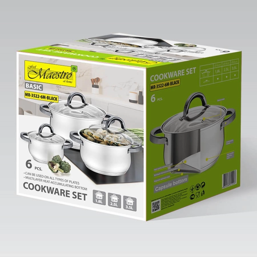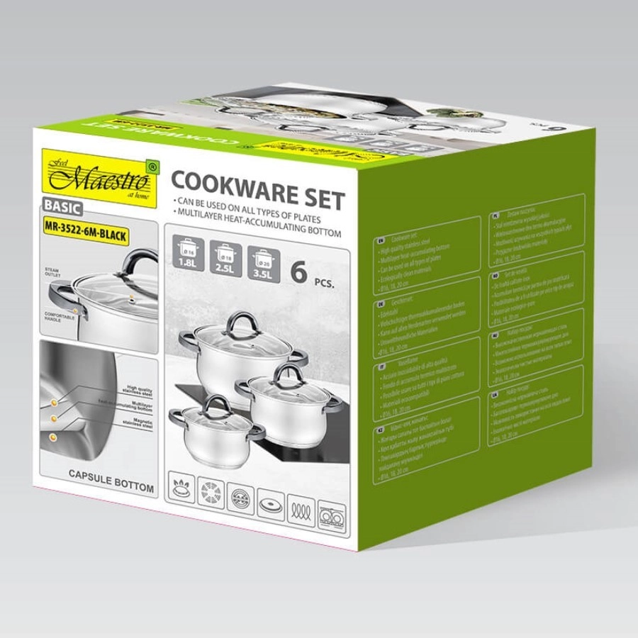 A MAESTRO edénykészlet praktikus megoldás azoknak a háztartásoknak, amelyek megbízható edényeket keresnek a mindennapi használathoz. A rozsdamentes acél tartósságot, könnyű karbantartást és egyenletes hőeloszlást biztosít, míg a fekete ergonomikus fogantyúk modern megjelenést és kényelmes fogást nyújtanak. Az üveg fedők lehetővé teszik, hogy a főzés mindig szem előtt legyen, és jobban megtartsák az aromát és a hőt.