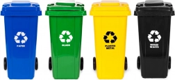 4 darab, 120 l-es, robusztus konténer kék, zöld, sárga és fekete színben a mindennapi hulladékválogatáshoz otthon, cégeknél és közterületeken. Az ellenálló HDPE védi az UV-sugárzással, vegyszerekkel és mechanikai sérülésekkel szemben, míg a záródó fedél megakadályozza a víz bejutását és a szagok kiáramlását.