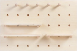 Praktikus fali rendszerező természetes fából és faforgácslapból, 40 × 60 cm méretben, amely rugalmas tárolást kínál a tipliknek kialakított nyílásoknak, 3 polcnak és 5 akasztónak köszönhetően. Könnyedén személyre szabhatja a kulcsok, kiegészítők vagy szerszámok elrendezését, és a legfeljebb 20 kg teherbírás révén előszobába, konyhába, dolgozószobába és műhelybe is illik.