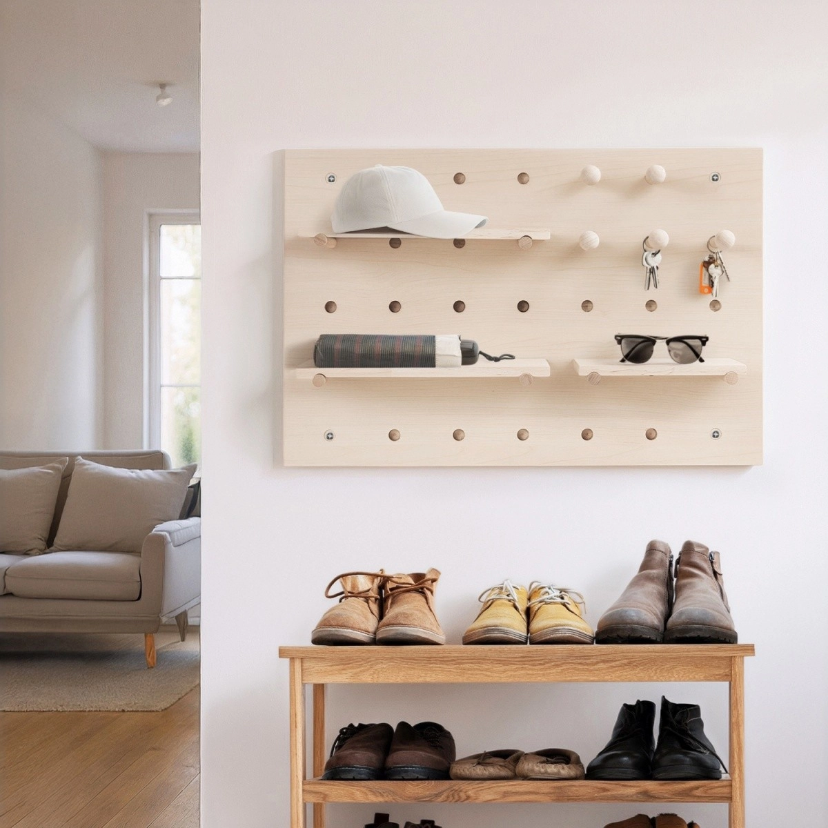 A MACLEAN fali pegboard rendszerező világos fa felülettel rendezett és elegáns tárolóhellyé alakítja a szabad falfelületet. A szabályos furatráccsal ellátott tábla lehetővé teszi a tiplik, akasztók és polcok szabad elhelyezését, így könnyen kijelölhet helyet kulcsoknak, szemüvegeknek, fejhallgatónak, irodaszereknek, dekorációnak vagy kisebb szerszámoknak.