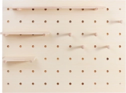 A MACLEAN fa pegboard tábla a világos fa elegáns megjelenését ötvözi a praktikus funkcionalitással. A furatrendszer lehetővé teszi 3 levehető polc és 5 kampó/tiplis elem szabad áthelyezését, így könnyedén kialakíthatja a saját elrendezését a mindennapi tárgyakhoz. Ideális előszobába, dolgozószobába, konyhába és műterembe.