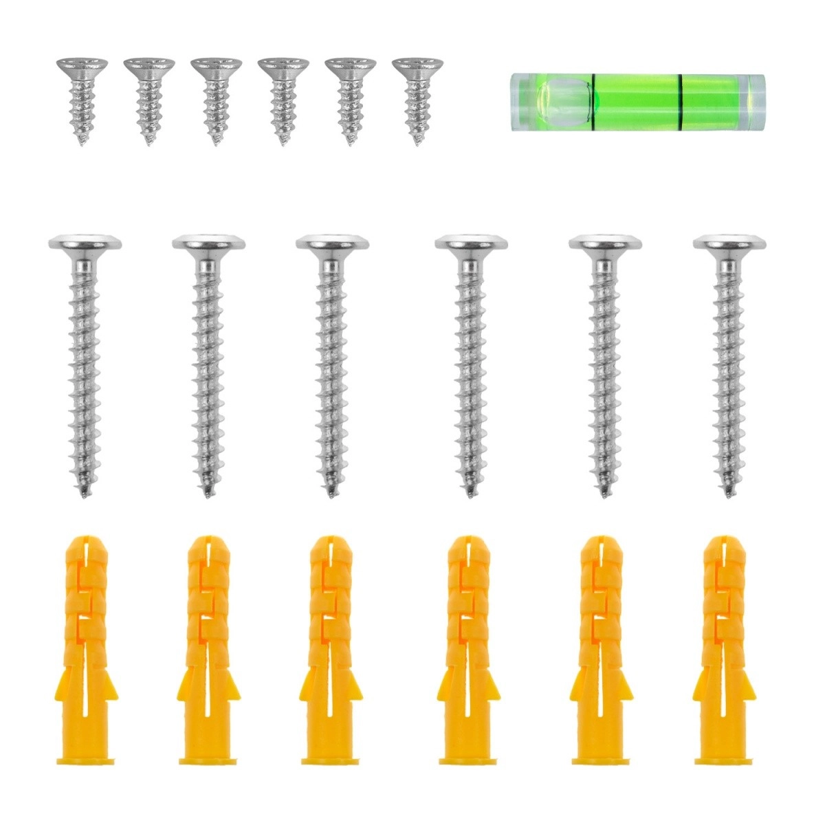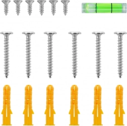 A csomag tartalmaz szerelőszettet csavarokkal, tiplikkel és mini vízmértékkel a pontos és gyors fali rögzítéshez.