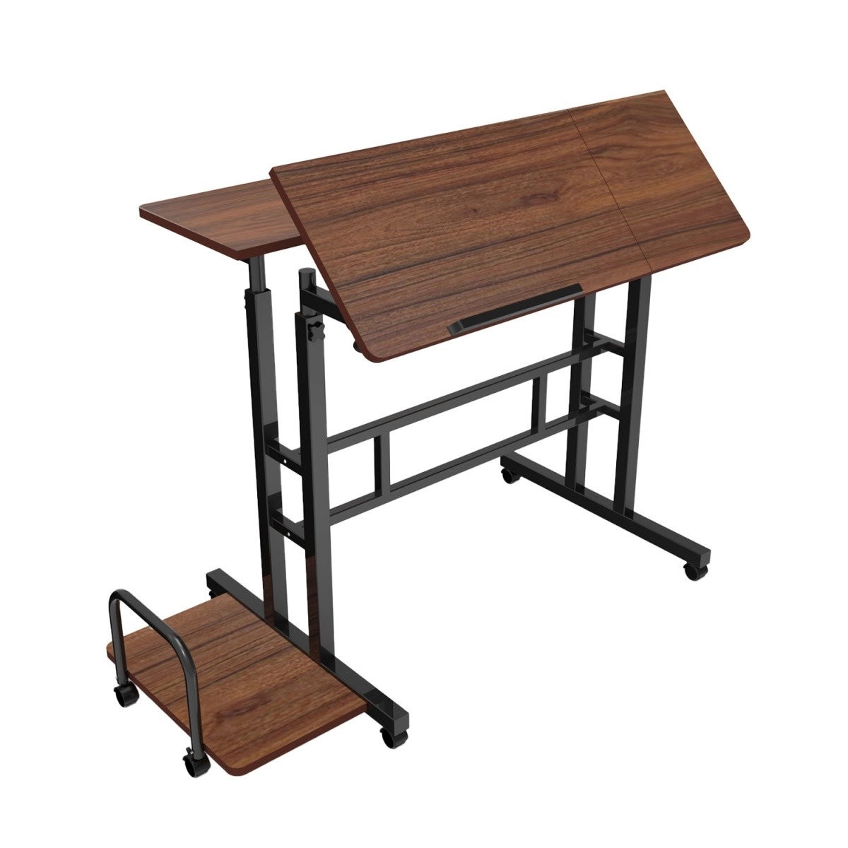 A fő lap dönthető az ergonomikus íráshoz, rajzoláshoz vagy laptopos munkához, az elülső perem pedig meggátolja az eszközök lecsúszását. A fékes kerekek egyszerre biztosítják a könnyű mozgatást és a stabil rögzítést munka közben. A masszív kivitel legfeljebb 50 kg maximális terheléssel megbízható társ a mindennapi használatban.