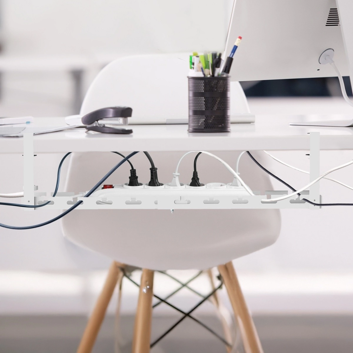 A praktikus, asztallap alá szerelhető rendező segít megfékezni a kábelkáoszt irodában, otthoni munkasarokban vagy gaming állomáson. A masszív fém konstrukció átvezető nyílásokkal és hosszanti slotokkal könnyű kábelvezetést és kötegelést tesz lehetővé, miközben elegendő helyet biztosít hosszabbítónak és töltőknek is.