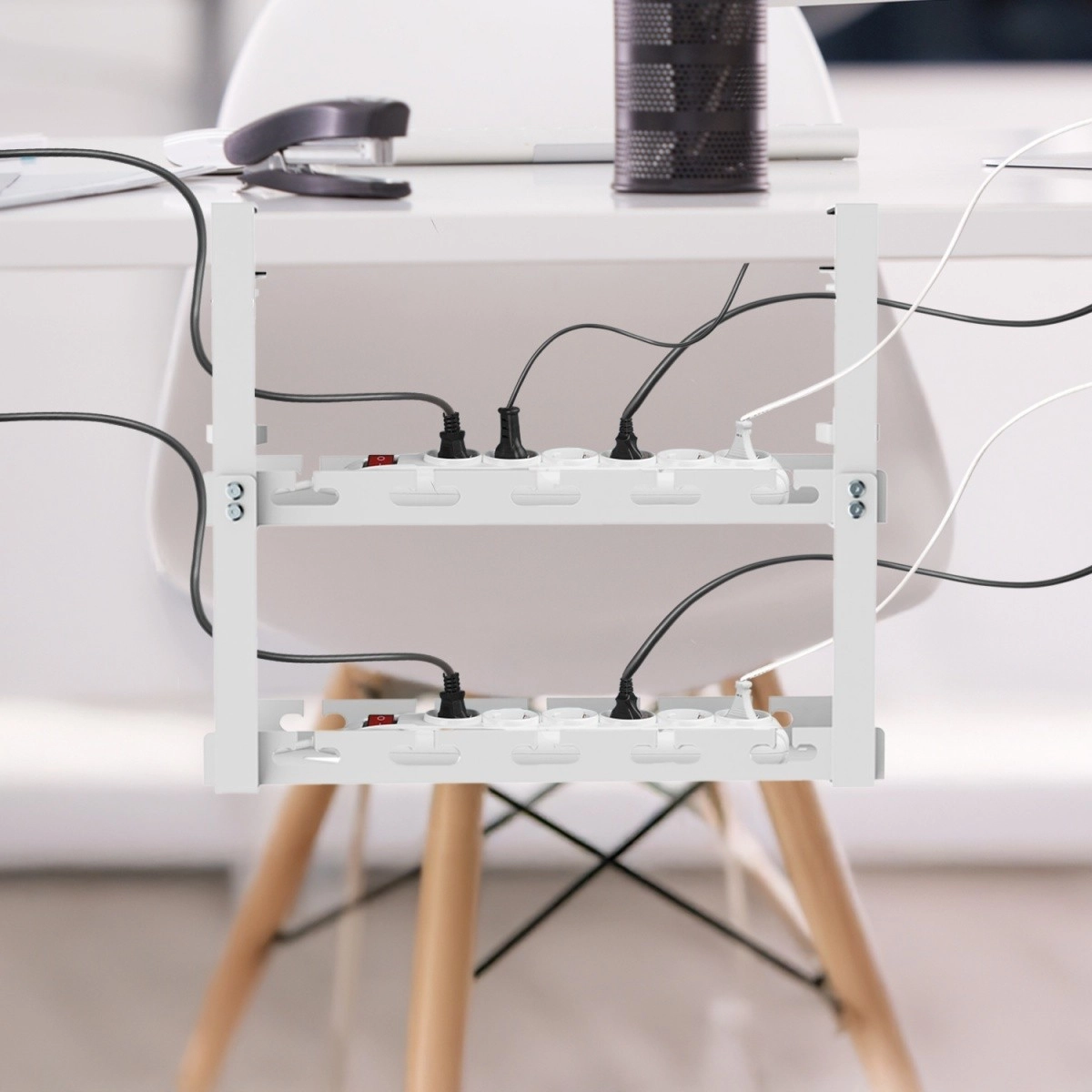 A két szint két hosszabbítót, adaptereket és tartozékokat is befogad – ideális igényes munkaállomásokhoz és otthoni irodákhoz.