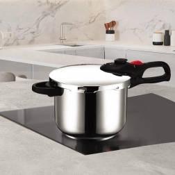 A biztonságot és a hatékonyságot a 80 kPa üzemi nyomás és a 130–180 kPa közötti fenntartott nyomástartomány támogatja, amely gyors és egyenletes főzést biztosít. A oldalsó fogantyús fedő és a tömítőgyűrű gondoskodik a tömítettségről és a kényelmes kezelhetőségről.