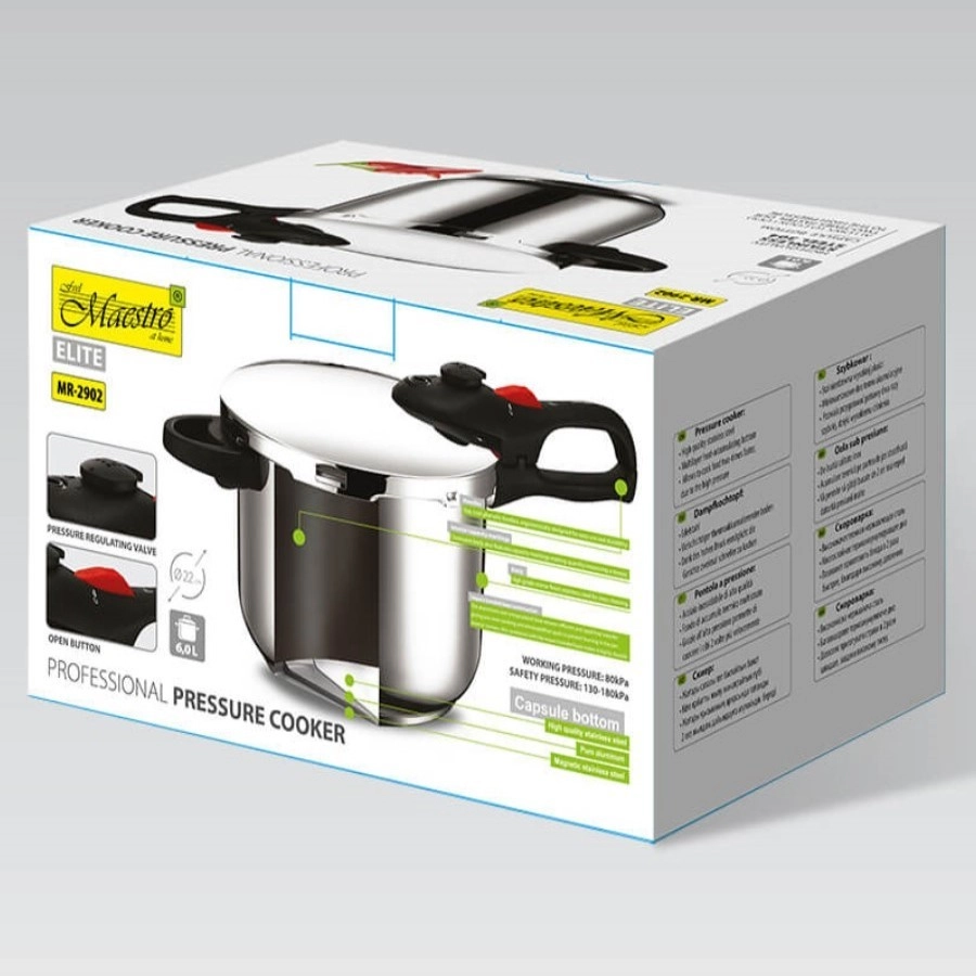 A praktikus Maestro kukta 6 l űrtartalommal, tartós rozsdamentes acélból felgyorsítja a főzést és energiát takarít meg. 22 cm átmérőjével a legtöbb tűzhelyhez illik, 80 kPa üzemi nyomással működik, a biztonságos tömítőgyűrűs zárás pedig megbízható, gyors főzést biztosít.