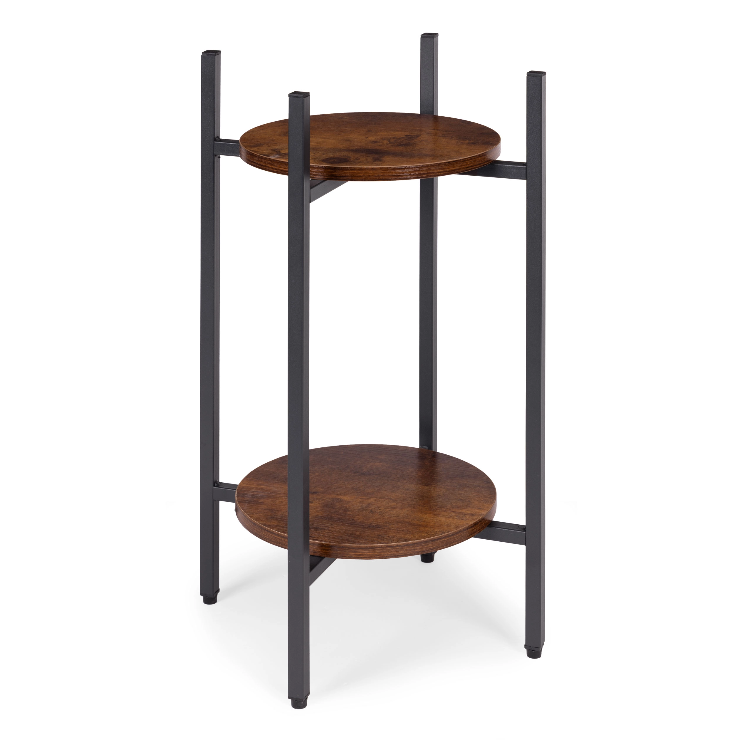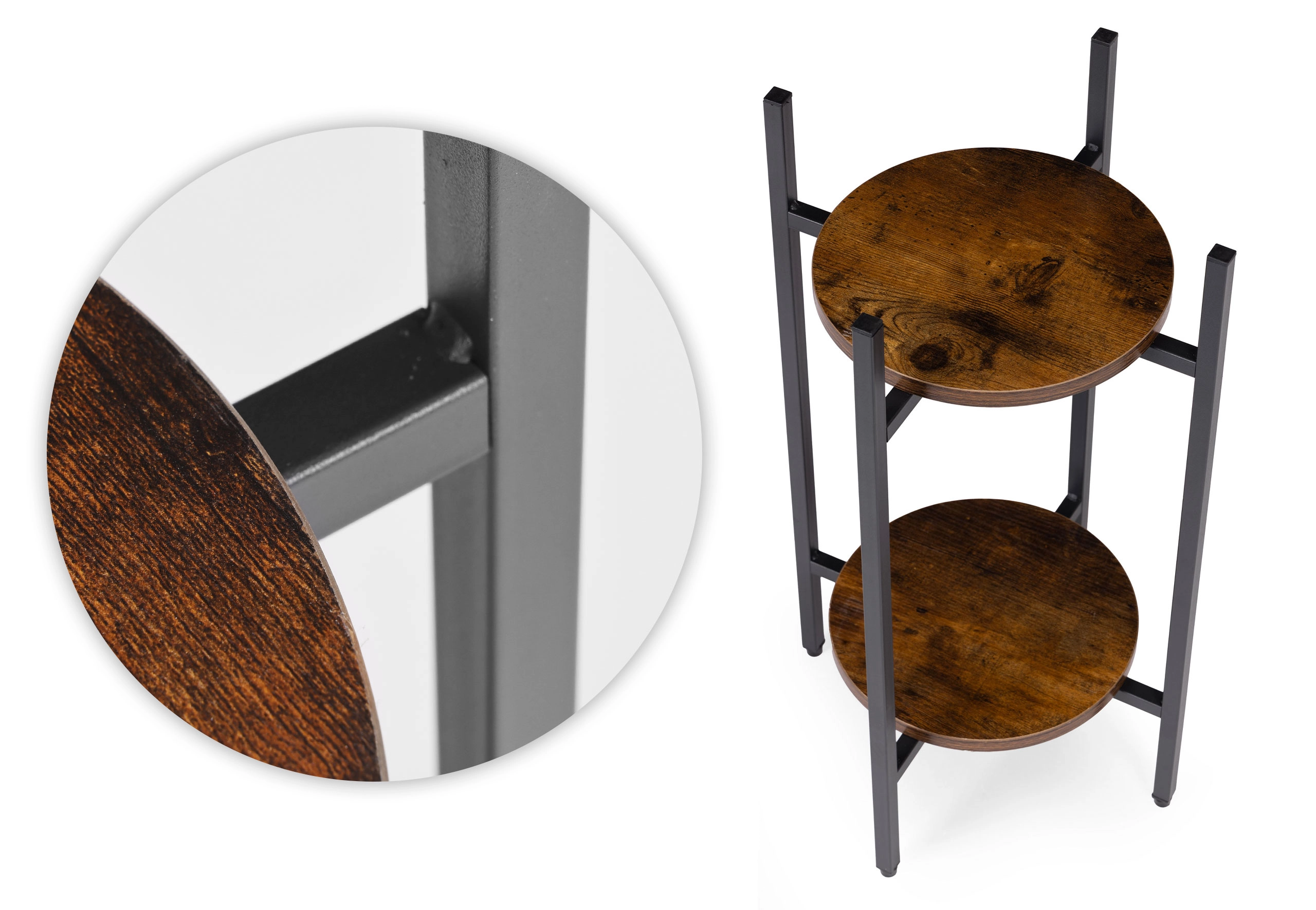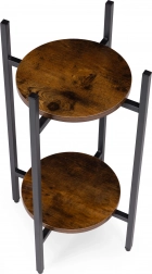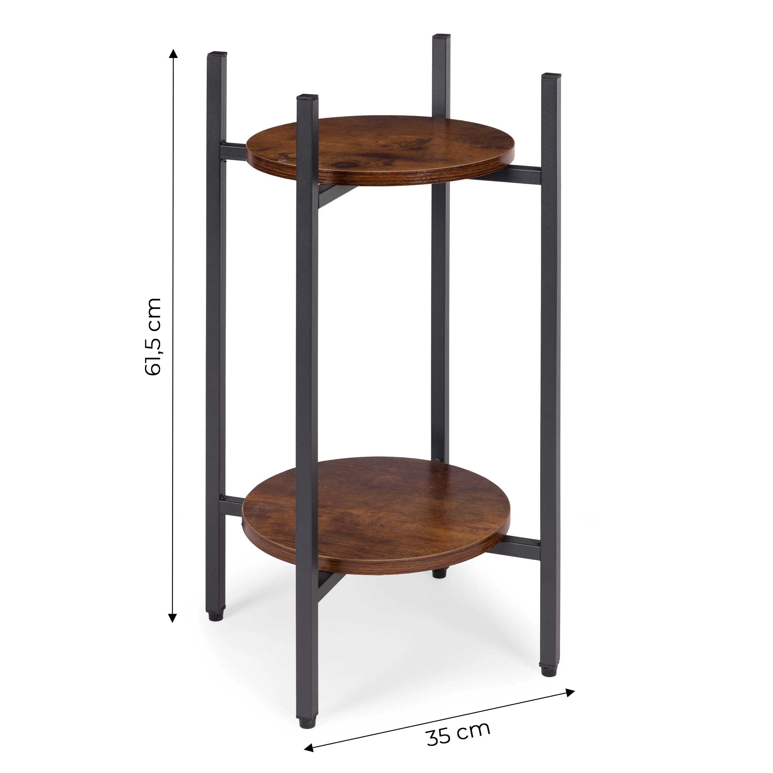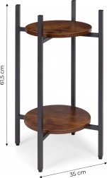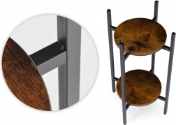 A porszórt acél szerkezet ellenáll a korróziónak és a mindennapi igénybevételnek, míg a fa hatású forgácslap polcok kiemelik a loft karaktert. A csúszásgátló végzárók védik a padlót és stabilitást biztosítanak. Legfeljebb 5 kg teherbírásával az állvány kisebb és közepes méretű kaspókhoz ideális.