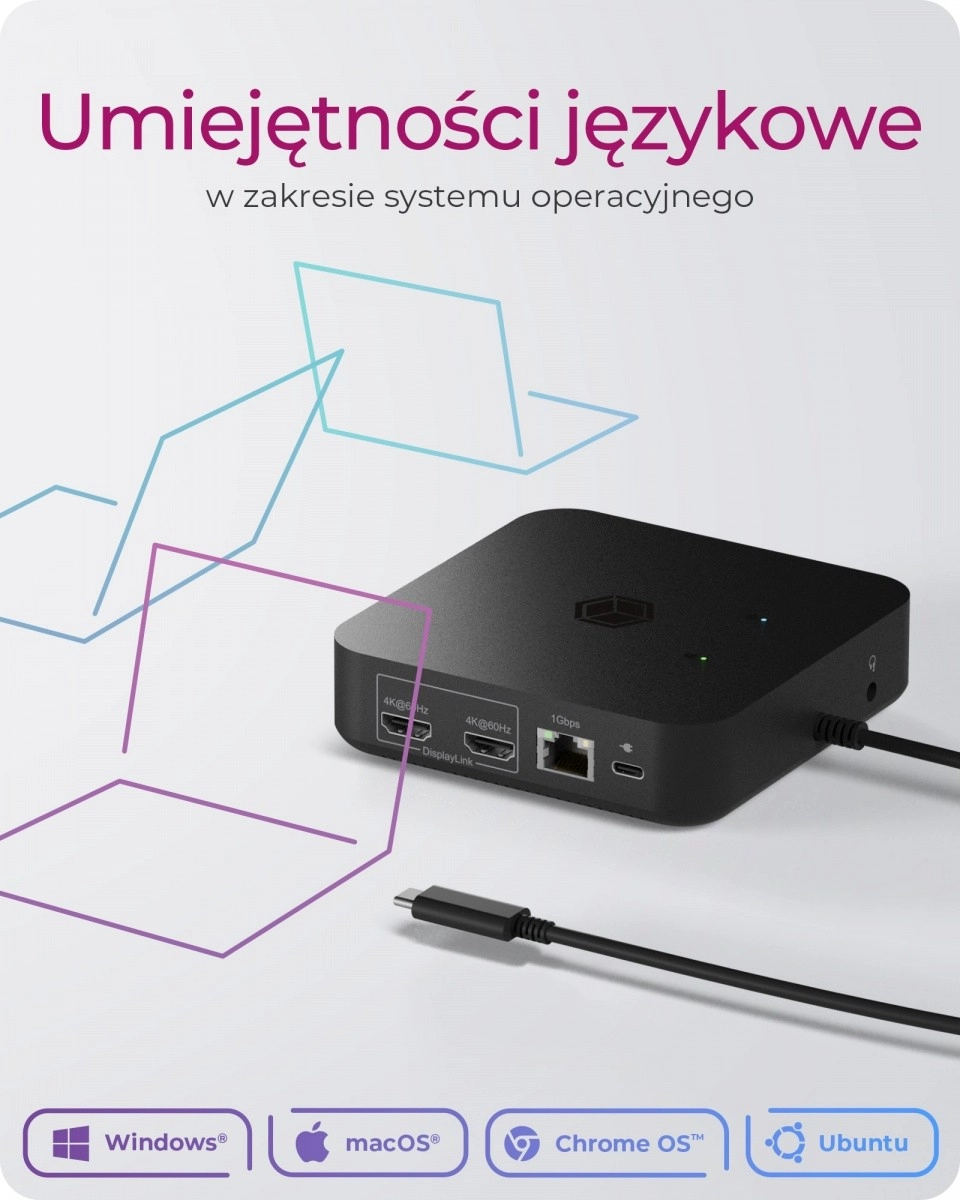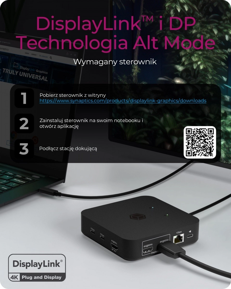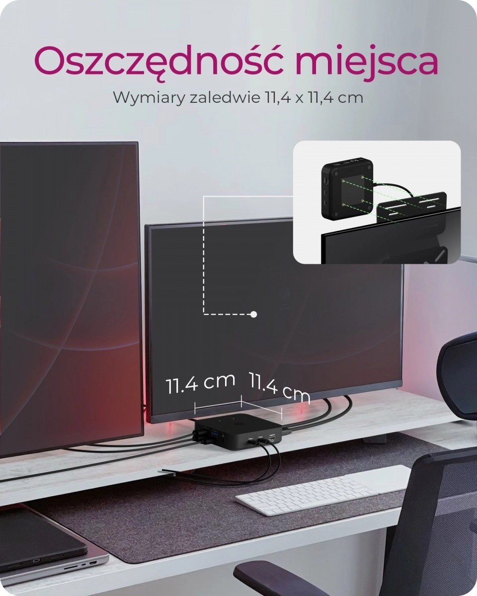 A 11,4 × 11,4 cm méretű kompakt ház helytakarékos, és VESA 50×50 mm tartóval a monitor mögé is rögzíthető (nem tartozék). A DisplayLink technológiának és a DP Alt Mode üzemmódnak köszönhetően rugalmas kijelzőbővítést kap olyan rendszereken is, amelyek natívan nem támogatnak több külső kijelzőt.