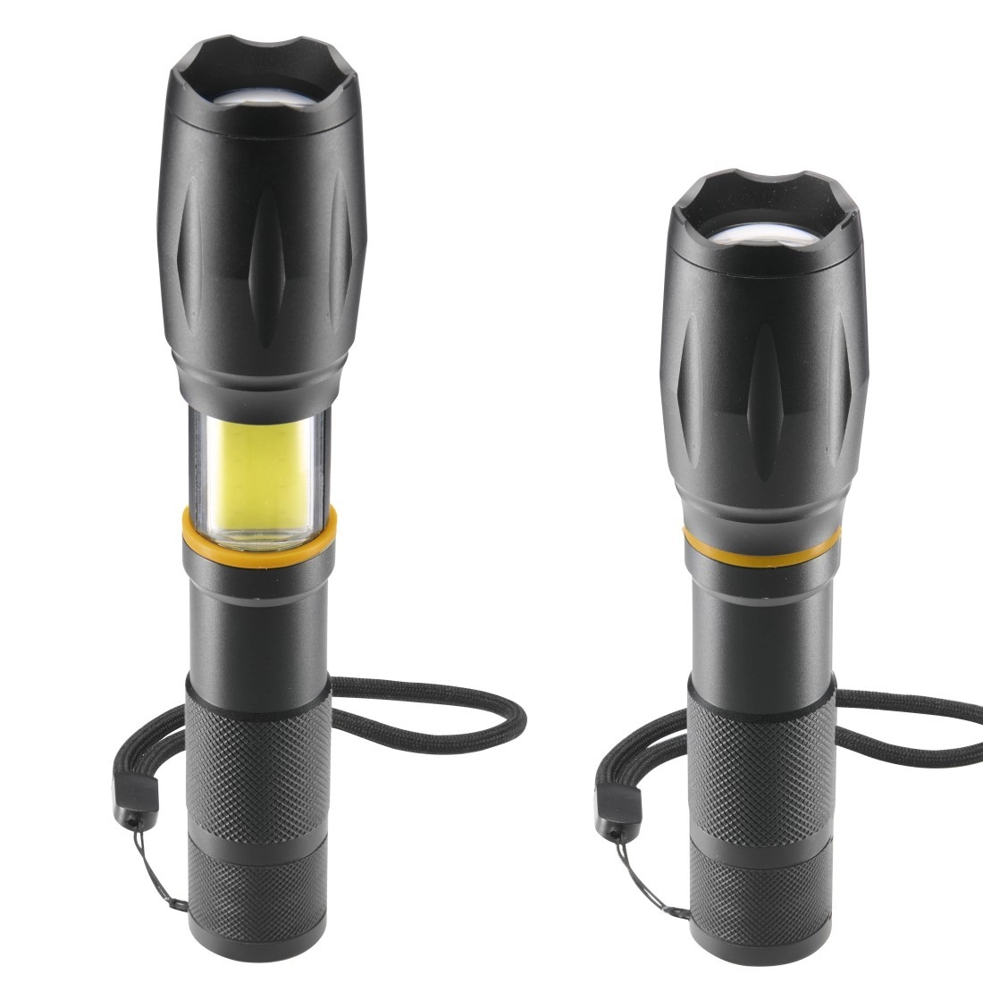 Ez a sokoldalú zseblámpa a nagy teljesítményű első LED-et oldalsó COB LED panellel kombinálja a maximális rugalmasság érdekében. Könnyedén választhat erős, tompított vagy villogó fény között, míg a zoom lencse lehetővé teszi a fénykúp pontos irányítását. A texturált, csúszásmentes felületű ház és a csuklópánt biztos fogást és kényelmes hordozást nyújt.