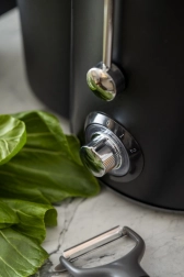 A biztonsági zárókar megakadályozza a helytelenül összeszerelt készülék indítását. A széles betöltőnyílás csökkenti a szeletelésre fordított időt, a levehető műanyag alkatrészek pedig mosogatógépben moshatók. A kompakt, modern dizájn fém kifolyóval és forgó szabályzóval bármelyik konyhapulton jól mutat.