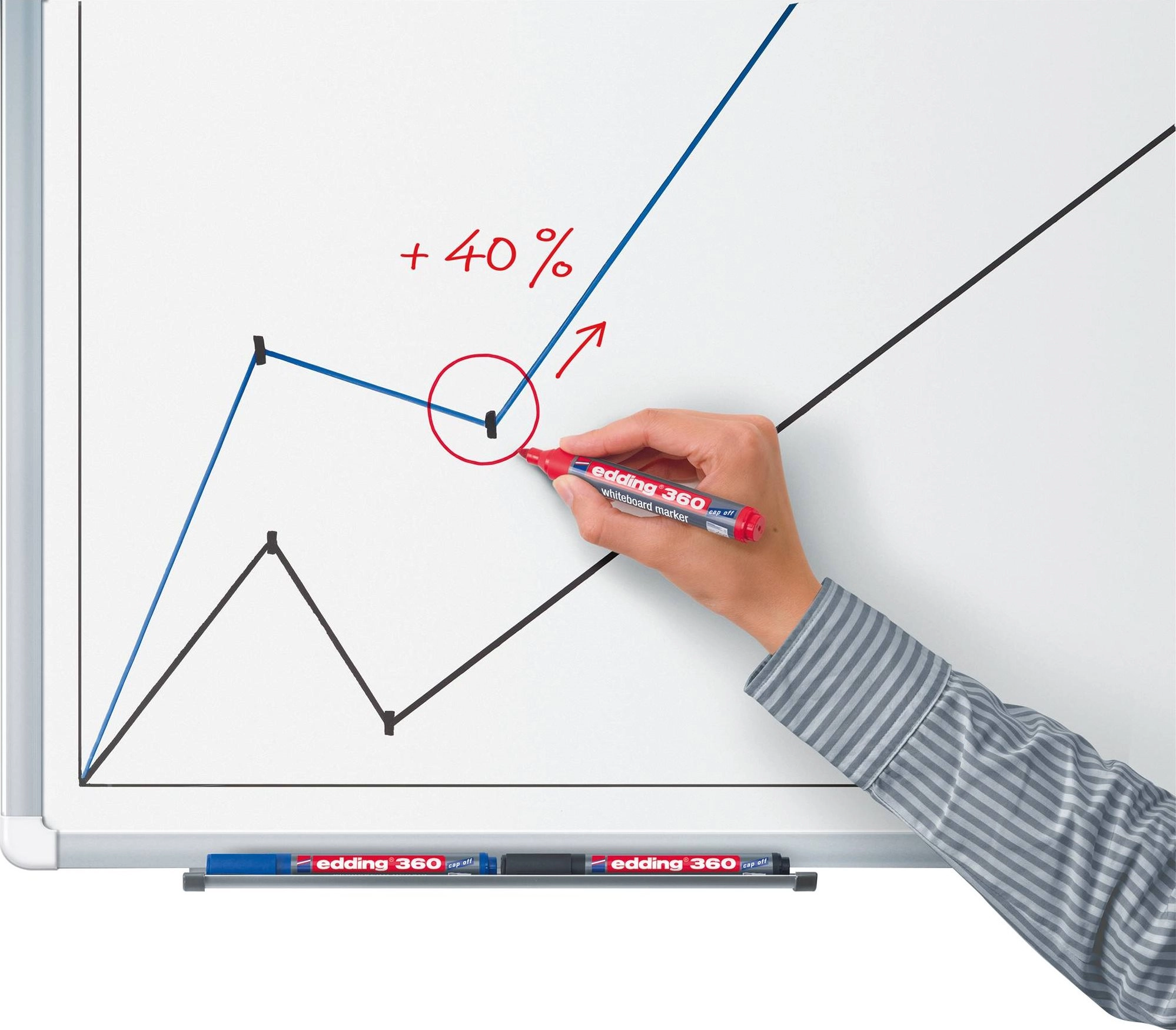 A népszerű Edding 360 marker ideális a mindennapos íráshoz minden típusú fehértáblán. Enyhe szagú, pigmentált tintájának és butil-acetátmentes összetételének köszönhetően kényelmesen használható irodában, iskolában és otthon. Az írás élénk, jól olvasható piros, és könnyen szárazon letörölhető nyomok hátrahagyása nélkül.