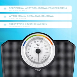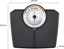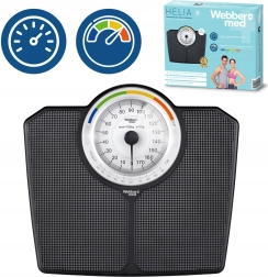 A klasszikus WEBBER mechanikus személymérleg akár 180 kg teherbírással megbízható mérést kínál elemek nélkül. A nagy, jól olvasható számlap 1 kg-os beosztással gyors és pontos leolvasást tesz lehetővé, a színes zónák és a BMI-funkció pedig segítenek a testsúly tájékozódó ellenőrzésében. Tartós kivitel, csúszásgátló felület és elegáns fekete dizájn – bármely fürdőszobába illik.