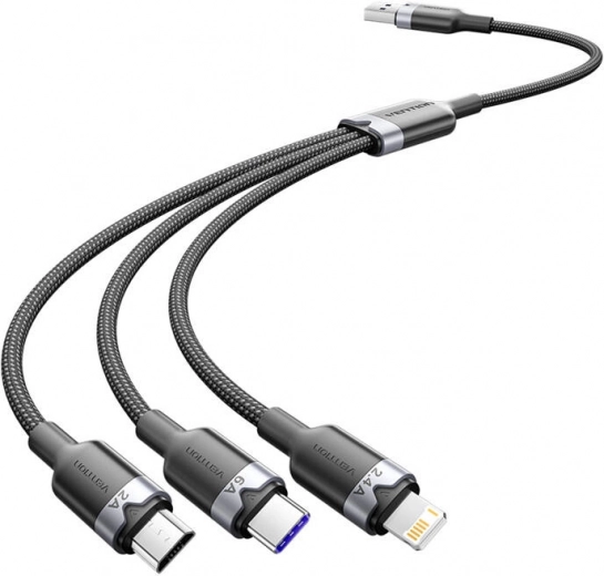 A Vention 3 az 1-ben egy praktikus kábel, amely több töltőt és vezetéket helyettesít. Támogatja a gyorstöltést akár 120 W-ig (USB‑C), és egyszerre több eszközt is képes ellátni. Beépített chipje okosan osztja el az energiát, így minden eszköz az optimális áramerősséget kapja túlmelegedés vagy túltöltés nélkül.