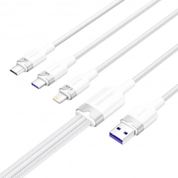 A Vention univerzális 3 az 1-ben kábele egyetlen vezetékkel akár három eszköz egyidejű töltését is lehetővé teszi. Kínál gyorstöltést akár 120 W-ig, intelligens teljesítményelosztást és adatátvitelt 480 Mb/s sebességgel. Az ellenálló fonott kivitelnek és a minőségi anyagoknak köszönhetően ideális mindennapi használatra otthon és irodában.