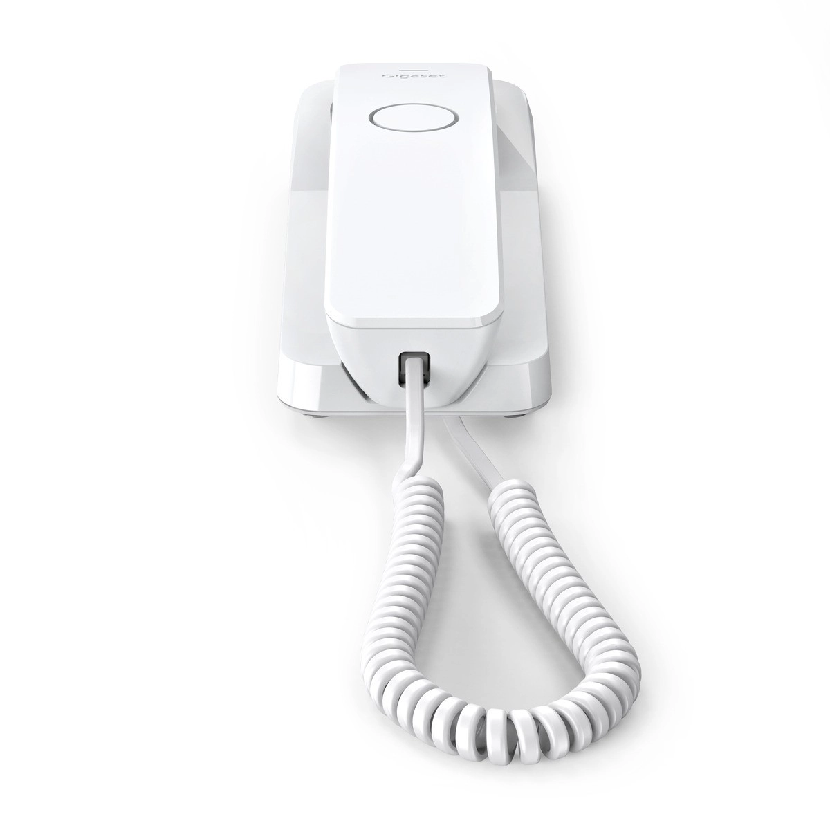 A Gigaset Desk 200 az analóg vezetékes telefonok alapfunkcióit rendkívül karcsú, helytakarékos dizájnnal ötvözi. A könnyű fali szerelésnek köszönhetően kisebb terekbe, recepciókra és műszaki helyiségekbe is ideális. A telefon közvetlenül az analóg vonalról kap tápot, így nincs szükség külső tápegységre – csak csatlakoztatni kell, és már hívhat is.