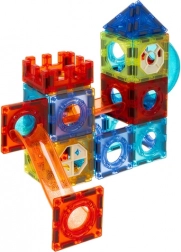 A mágneses kockák és pályaelemek tartós ABS műanyagból készülnek, és a erős mágneseknek köszönhetően könnyen, stabilan kapcsolódnak egymáshoz. A gyerekek síkbeli és térbeli szerkezeteket, tornyokat, hidakat és főként kreatív golyópályákat építhetnek alagutakkal, kanyarokkal és tálakkal. A áttetsző színek segítik az alak- és színfelismerést, és ösztönzik a felfedezést.