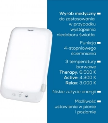 A 3 választható színhőmérsékletnek köszönhetően könnyen a napi rutinjához igazíthatja a fényt: Active (4300 K) a délelőtti, fókuszált munkához, Therapy (6500 K) a déli fényterápiához 10 000 lx intenzitással, valamint Relax (3000 K) az esti ellazuláshoz. Az érintésvezérlés, a 4 fokozatú fényerő-szabályzás és a kezelési időzítő 4 lépésben kényelmes használatot biztosít.