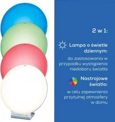 A Moodlight funkcióval kellemes atmoszférát teremthet színes háttérvilágítással. A mobilalkalmazásban választhat a 10 előre beállított jelenet közül, beállíthatja a fényerőt és az időzítőt, vagy kézzel kiválaszthat és rögzíthet egy színt a 256 árnyalat közül. A praktikus LED időzítő öt terápiás időt kínál, és a beállított idő letelte után a lámpa automatikusan kikapcsol.