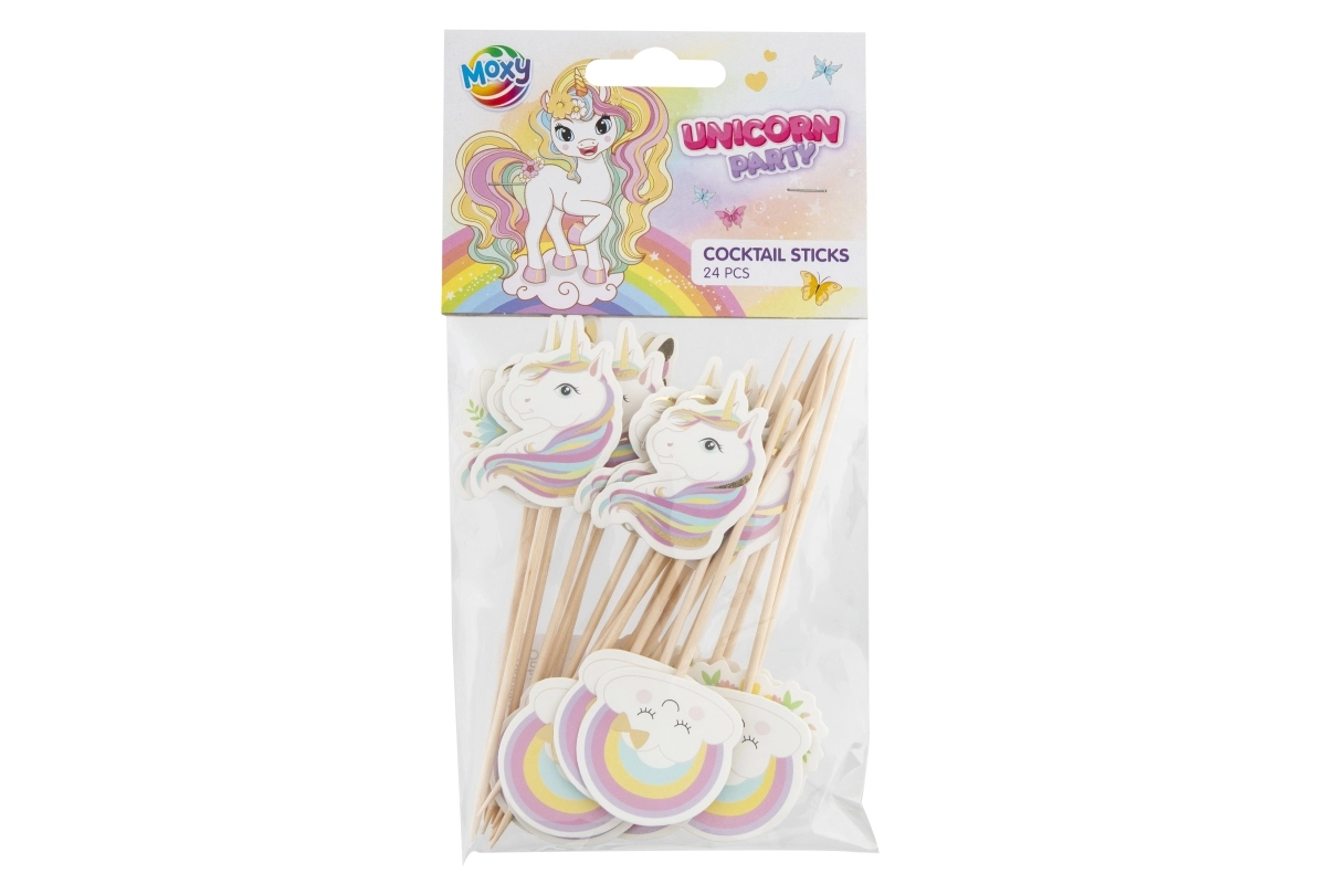 Varázsolj ragyogást minden bulira a unikornis motívumos koktélpálcikákkal! A csomagban 24 db fa fogvájó található papír díszekkel, ideálisak koktélokhoz, desszertekhez és cupcake-ekhez. Könnyen használhatók, pehelysúlyúak, és azonnali partyhangulatot teremtenek.
