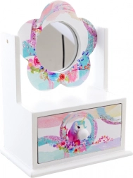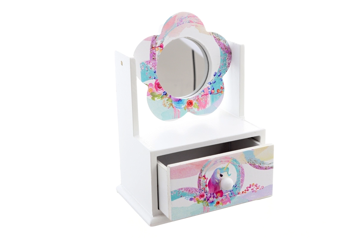 Ez a bájos fa ékszerdoboz virág alakú tükörrel minden kis parádézót elragadtat. A cuki unikornisos dizájnnal nemcsak szép dekoráció, hanem praktikus hely az apró ékszerek és kincsek tárolására is.