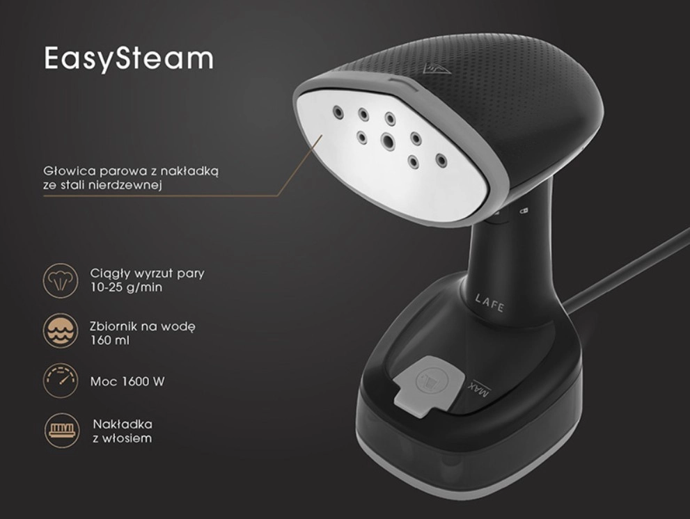 A Lafe EasySteam praktikus alternatíva a vasalóhoz a ruhák gyors és kíméletes kisimításához. A 1600 W teljesítménynek és a stabil, 15–25 g/perc gőzkibocsátásnak köszönhetően megbirkózik a mindennapi gyűrődésekkel anélkül, hogy károsítaná az érzékeny anyagokat. A rozsdamentes fej egyenletesen oszlatja el a gőzt a hatékony eredményért.