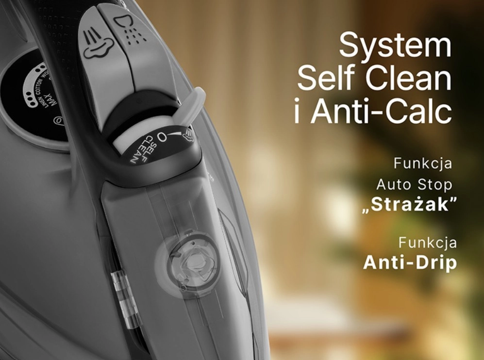 A tartós kerámia vasalótalp sima siklást, egyenletes hőelosztást és a textíliák védelmét biztosítja a károsodással szemben. A 600 ml-es víztartály lehetővé teszi a hosszabb vasalást gyakori utántöltés nélkül. A tiszta és biztonságos működésért a vasaló Anti-Drip (csepegésgátló), Anti-Calc és Self Clean (vízkőmentesítés és öntisztítás), valamint Auto Stop funkcióval (automatikus kikapcsolás tétlenség esetén) van felszerelve.