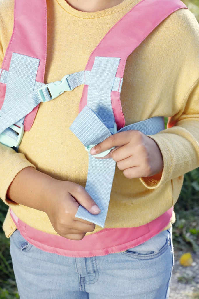 A puha, párnázott pántok, a mellcsat és a deréköv stabilitást biztosítanak, míg az állítható csatok könnyen alkalmazkodnak a gyermek alkatához. Finom virágos és parkos motívumok, szitakötőkkel és tavirózsákkal, varázslatos megjelenést kölcsönöznek a kiegészítőnek, amely serkenti a képzeletet.