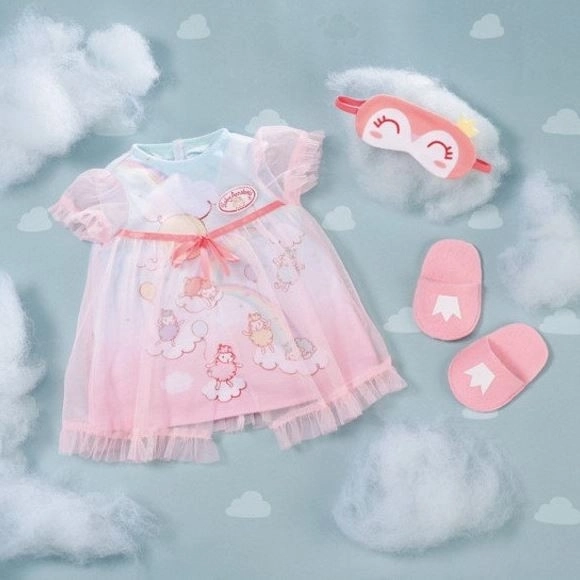 Ezzel az éjszakai hálóinggel Baby Annabell úgy érzi magát, mintha egy felhőn lenne. A tüll felső szoknyácskának és vidám bárány mintáknak köszönhetően a babád örömmel fog elaludni minden este. Az esti rituálét cuki alvómaszk és könnyen levehető papucsok kísérik.