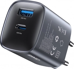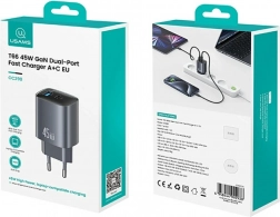 Kompakt hálózati töltő GaN technológiával és összesen 45 W teljesítménnyel, két univerzális porttal USB‑C + USB‑A a gyors és biztonságos töltéshez. Támogatja a USB Power Delivery (PD) és a Quick Charge (QC) szabványokat, így megbízhatóan feltölti az okostelefonokat, táblagépeket és egyes notebookokat USB‑C-n keresztül. Széles bemeneti feszültségtartományának köszönhetően ideális utazáshoz, a beépített OVP/OTP védelmek pedig biztonságos működést garantálnak.