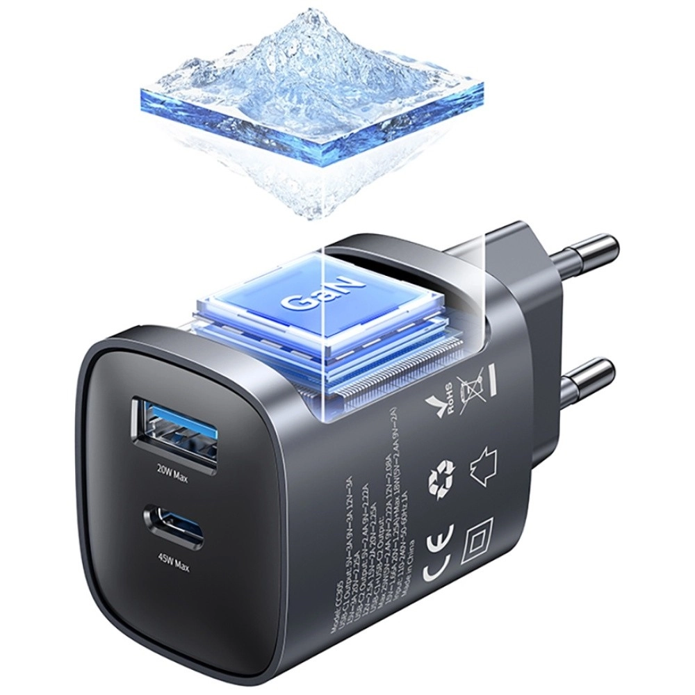 Ez a modern töltő rendkívül hatékony GaN technológiát használ, amely a hagyományos adapterekhez képest kisebb méretet, alacsonyabb melegedést és nagyobb hatékonyságot kínál. A 45 W összteljesítmény gyors töltést tesz lehetővé a legújabb eszközök számára, és a PD/QC támogatásnak köszönhetően akár 45 W-ig egyes USB‑C-s notebookokkal is megbirkózik.