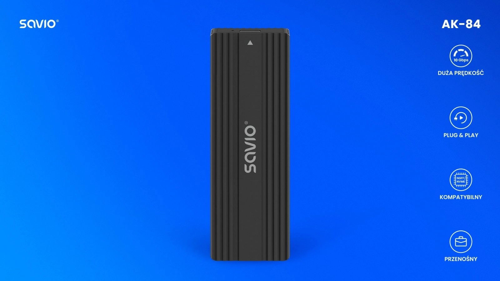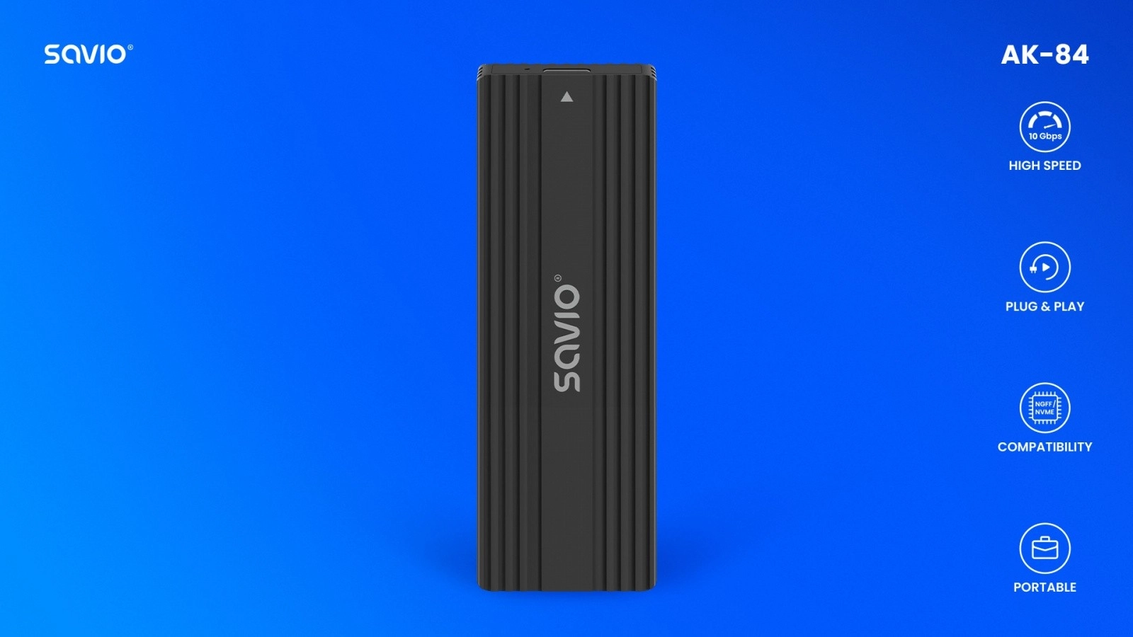 Az elegáns és tartós SAVIO AK‑184 ház azonnal nagy teljesítményű hordozható tárhellyé alakítja M.2 SSD-jét (NVMe és SATA/NGFF). Az USB 3.1 Gen 2-nek köszönhetően akár 10 Gb/s sebességet ér el, így a nagy fájlok, biztonsági mentések és játékok pillanatok alatt átmásolhatók. A kompakt méret és mindössze 44 g tömeg ideális útitárssá teszi.
