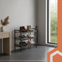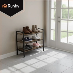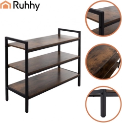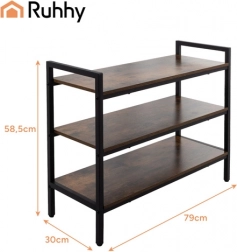 A praktikus, loft stílusú RUHHY cipőtartó ötvözi a funkcionalitást, stabilitást és elegáns megjelenést. Három masszív polc polconként 30 kg teherbírással elbírja az egész család lábbelijét, míg a tartós fém váz és a meleg tónusú fa polcok modern karaktert adnak a belső térnek. A kompakt 79 × 30 × 58,5 cm méretek helytakarékosak, a védőtalpak pedig megóvják a padlót a karcolásoktól.