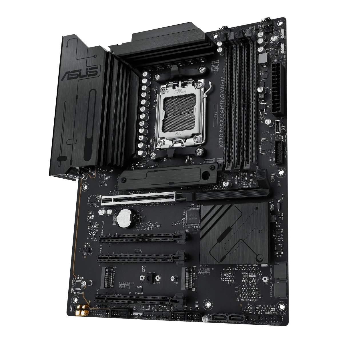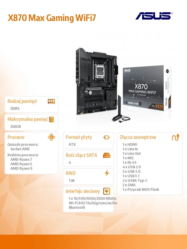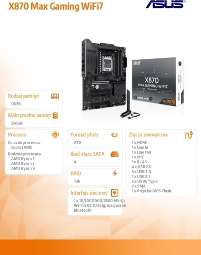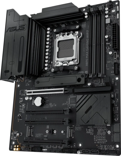 Az ASUS X870 Max Gaming WiFi 7 egy csúcskategóriás, AM5 platformra szánt gamer alaplap, amely kiaknázza a 9000-es sorozatú AMD Ryzen processzorok teljesítményét. Stabil VRM tápellátást, masszív VRM- és M.2-hűtést ötvöz a modern csatlakoztathatósággal – beleértve a Wi‑Fi 7-et és az USB‑C-t –, hogy sebességet, stabilitást és nagy sávszélességet biztosítson játékhoz, tartalomkészítéshez és AI munkafolyamatokhoz.