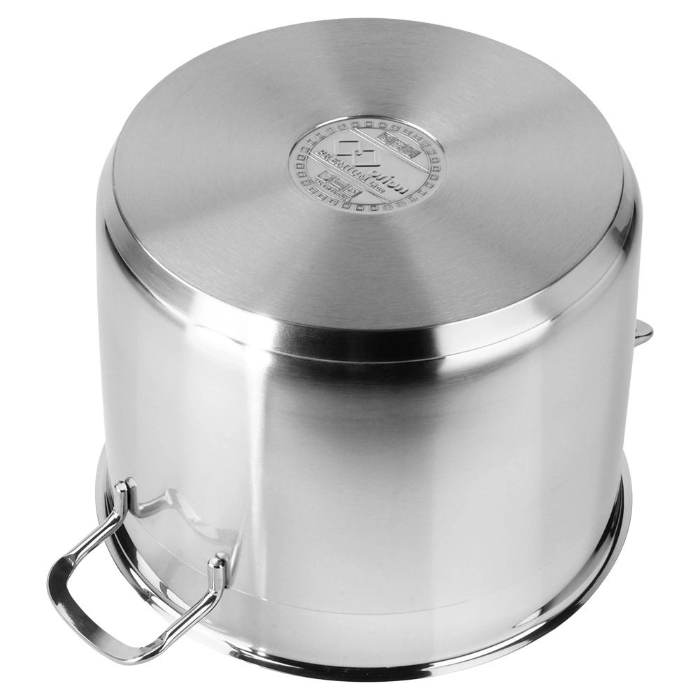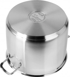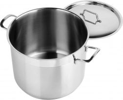 Prémium rozsdamentes acél fazék 10 l űrtartalommal és 26 cm átmérővel, ideális főzéshez és pároláshoz minden tűzhelytípuson, beleértve az indukciót is. Többrétegű akutermikus aljjal a gyors és egyenletes hőeloszlásért, masszív falakkal, kényelmes rozsdamentes acél fogantyúkkal, és pontos illeszkedésű fedővel szállítva. Könnyen tisztítható és mosogatógépben mosható.