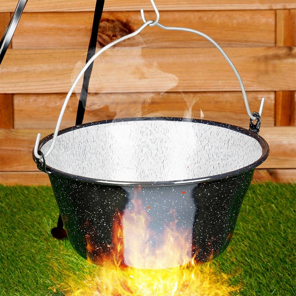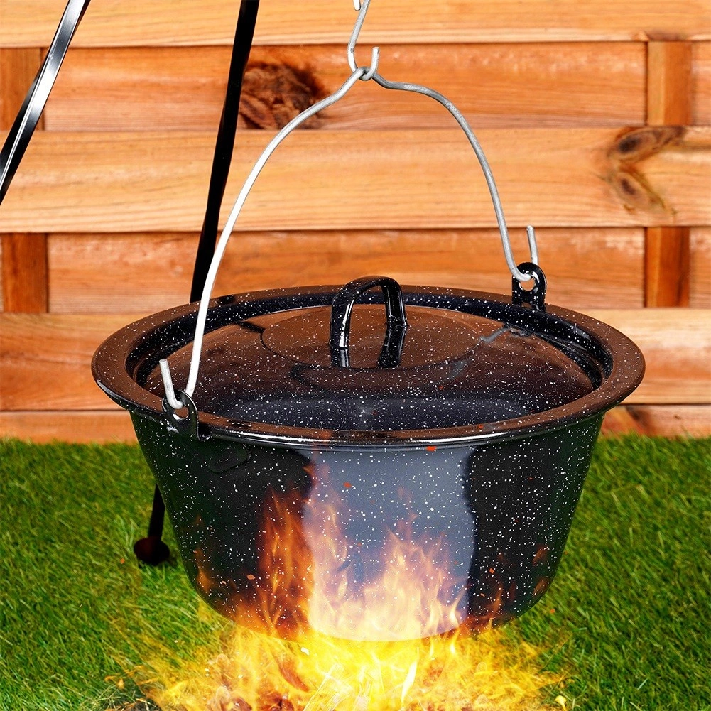 Az erős függesztő fül megkönnyíti a hordozást és a biztonságos felfüggesztést a tűz fölé. Tökéletes szabadtéri főzéshez a kertben, kempingezéskor és grill mellett is.