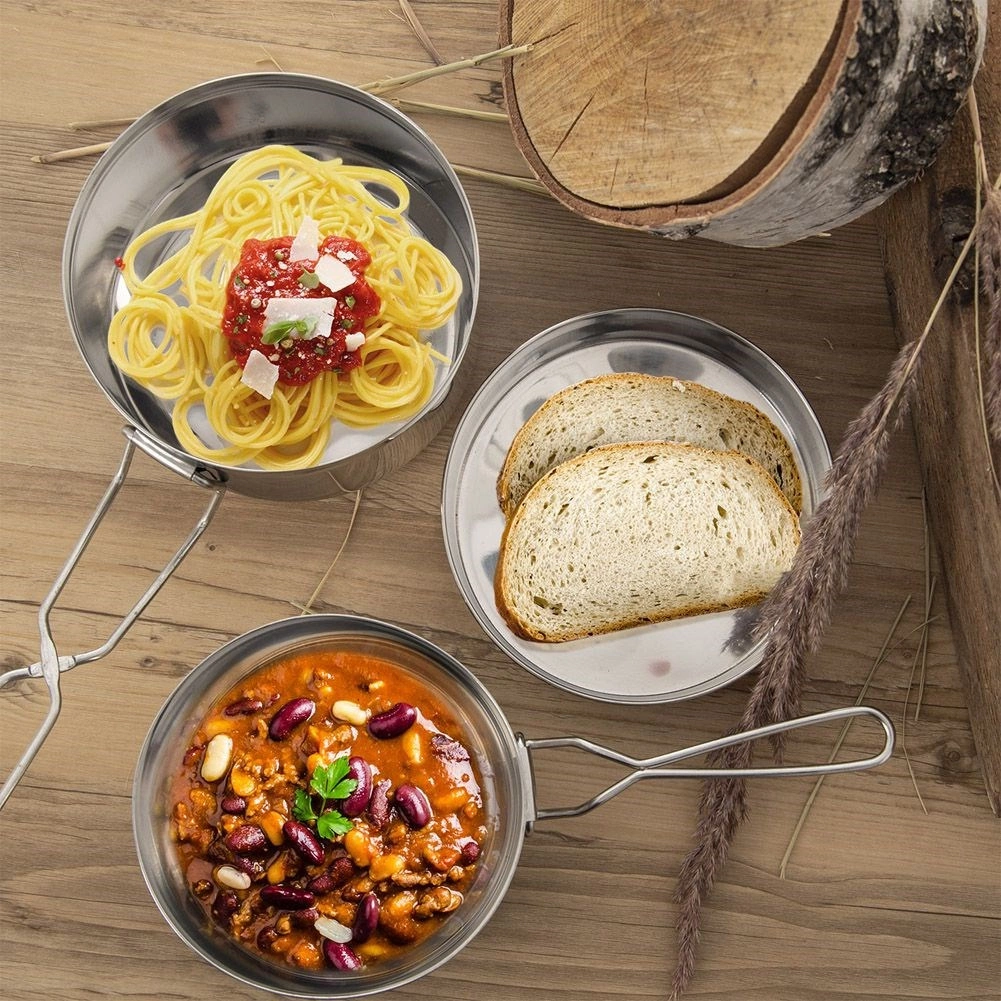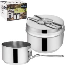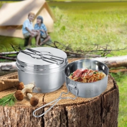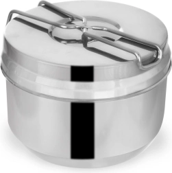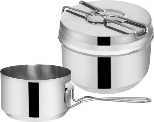 Ez a 3 részes kemping menázsi rozsdamentes acélból mindent kínál, amire útközben az étkezéshez szükség van. Szétszedve két kis lábast és egy fedőt / tányért kap, a kényelmes szedéshez és tálaláshoz. Az összecsukható fogantyúknak köszönhetően a teljes készlet könnyen befér a hátizsákba, és kész minden kalandra.