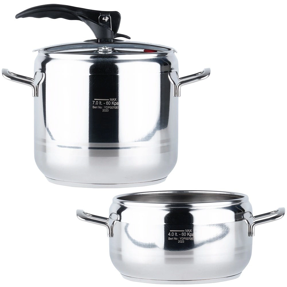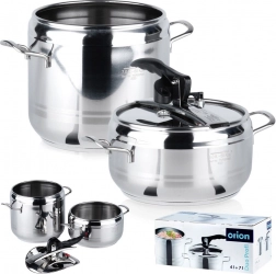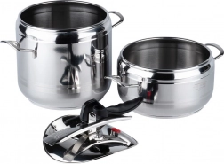 Praktikus, két darabból álló rozsdamentes kuktaszett 4 és 7 literes űrtartalommal, egy univerzális fedővel a gyors és energiatakarékos főzéshez. A nyomás alatti főzésnek köszönhetően az ételek jóval gyorsabban készülnek el, kevesebb energiafelhasználással, miközben megmarad az íz és a tápanyagok. A szett kompatibilis gáz-, elektromos, üvegkerámia, halogén és indukciós főzőlapokkal, és biztonságos használatot kínál 2 biztonsági szeleppel és állítható nyomásszabályozással. A minőségi rozsdamentes acél és a 3 rétegű akutermikus talp egyenletes melegítést és hosszú élettartamot biztosít.