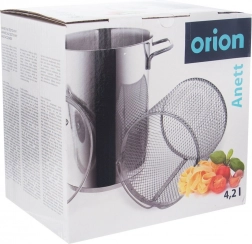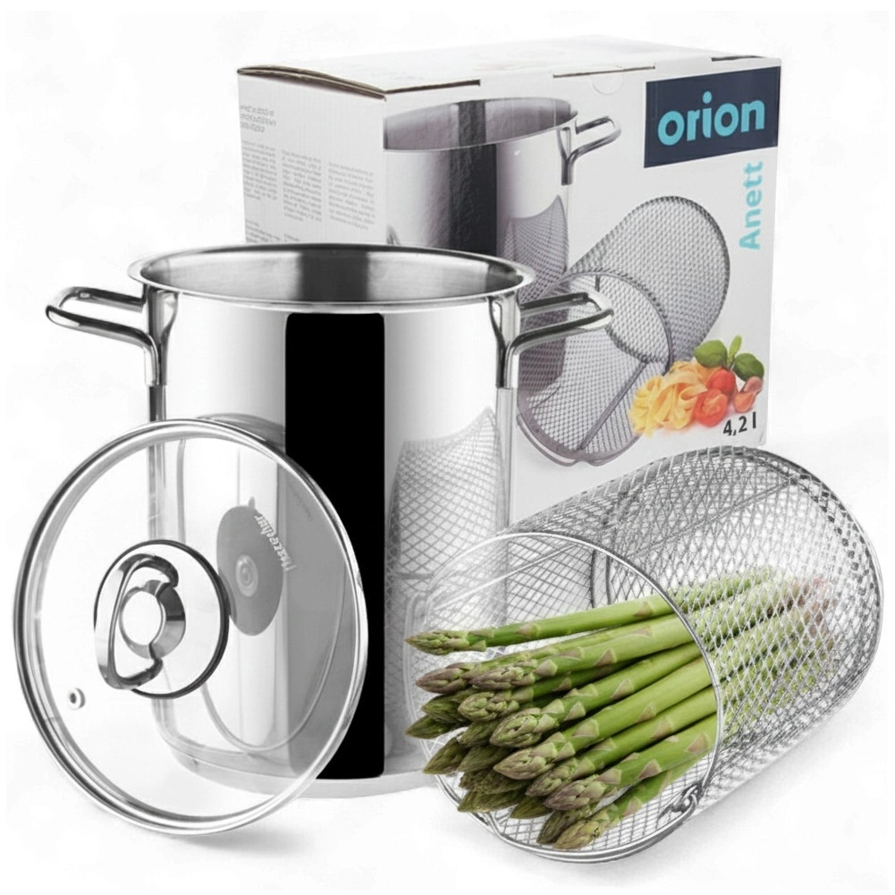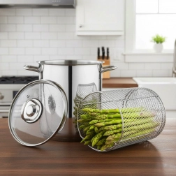 A rozsdamentes acél kosár praktikus fogantyúval lehetővé teszi a spárga vagy tészta behelyezését, majd főzés után biztonságos és gyors leszűrését közvetlenül az edényből.