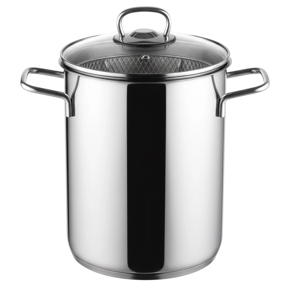 Az ANETT rozsdamentes acél edény masszív, 304-es acélból készült – kívül magasfényű, belül matt felület az egyszerű tisztításért. Az üvegfedő rozsdamentes acél peremmel és szellőzőnyílással megkönnyíti a forrás ellenőrzését, a kivehető rozsdamentes acél kosár fogantyúval kényelmes bemerítést és azonnali leszűrést biztosít külön szűrő nélkül.