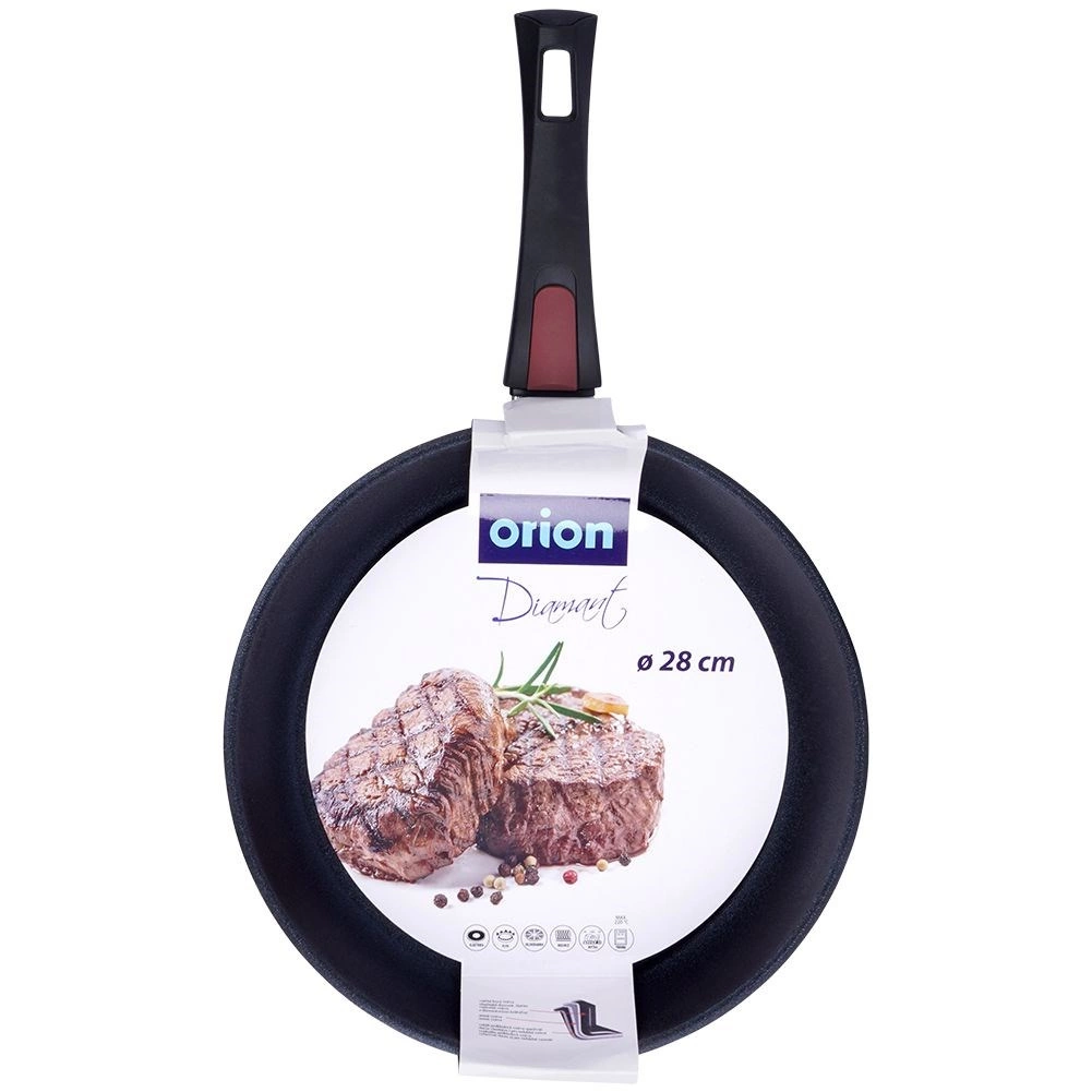 Masszív, öntött alumíniumból készült serpenyő gyémánttal erősített tapadásmentes felülettel és levehető, nem melegedő nyéllel a könnyű főzéshez és sütéshez sütőben egészen 220 °C-ig. Gyors és egyenletes hőeloszlást kínál, minden típusú tűzhelyhez, beleértve az indukciót is alkalmas, lehetővé teszi az alacsony zsírtartalmú sütést, és könnyen tisztítható, akár mosogatógépben is. Eredeti ORION márkatermék.