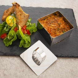 Ez a kiváló minőségű rozsdamentes acélból készült, praktikus tömővel ellátott négyzet alakú forma lehetővé teszi, hogy éttermi színvonalon tálaljon. Könnyedén készíthet vele rendezett rétegeket és adagokat – desszertektől a salátákon át a köretekig, burgonyáig vagy rizsig. A sima falak tiszta kioldást biztosítanak szakadozott szélek nélkül.