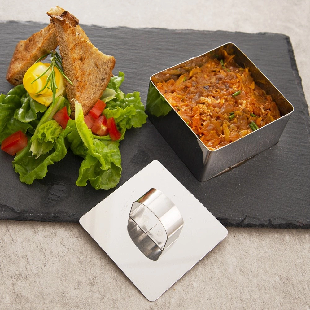 A négyzet alakú forma tömővel tökéletesen egyenes éleket és egységes adagokat hoz létre a professzionális tálaláshoz.