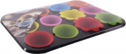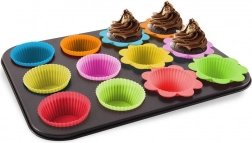 Praktikus muffinforma 12 színes szilikon kosárkával, amely megkönnyíti az édes és sós finomságok sütését. A tapadásmentes felületnek és az ellenálló szilikon formáknak köszönhetően a tészta nem ragad le, a muffinok pedig könnyen kivehetők. A forma egyszerre 12 darab elkészítését teszi lehetővé, a kosárkák pedig többször használhatók sütőben, mikróban és fagyasztóban is.