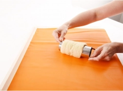 A tapadásmentes szilikon alátét stabil felületet ad a tészta nyújtásához és formázásához, mielőtt a formára tekeri.