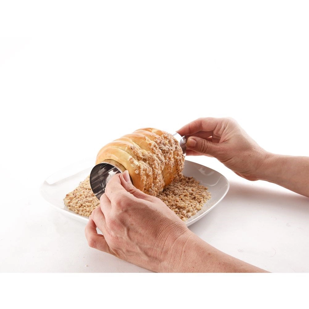 Az integrált fogantyúk kényelmes forgatást tesznek lehetővé sütés közben, valamint a vajjal való kenést és a szóratokba hempergetést is megkönnyítik.