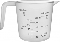 Praktikus konyhai mérőedény füllel és kiöntőcsőrrel a könnyű kiöntéshez. Tartós és egészségre ártalmatlan átlátszó műanyagból készült, könnyű, könnyen tisztítható, és lehetővé teszi a pontos mérését folyadékoknak és szilárd alapanyagoknak 250 ml/300 g-ig.