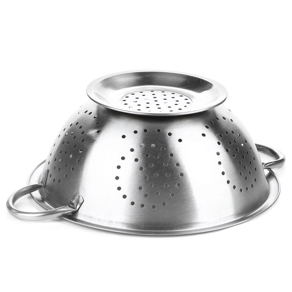 Univerzális, 28 cm átmérőjű rozsdamentes szűrő praktikus oldalsó fogantyúkkal és stabil talppal, amely megkönnyíti gyümölcs és zöldség mosását, valamint a tészta leszűrését. Minőségi rozsdamentes acélból készült, tartós, élelmiszerbiztonságos, és a sűrű perforációknak köszönhetően gyorsan elvezeti a vizet.